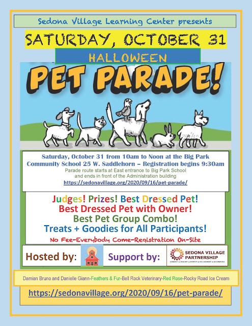 What an idea!! A pet parade in the Village of Oak Creek hosted by the Sedona Village Partnership and Sedona Village Learning Center to give families – big people and little people – a bit of Halloween festivity in a safe setting.